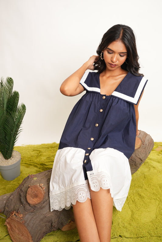 WHITE AND BLUE CONTRAST SHIRT DRESS WITH LACE DETAILING